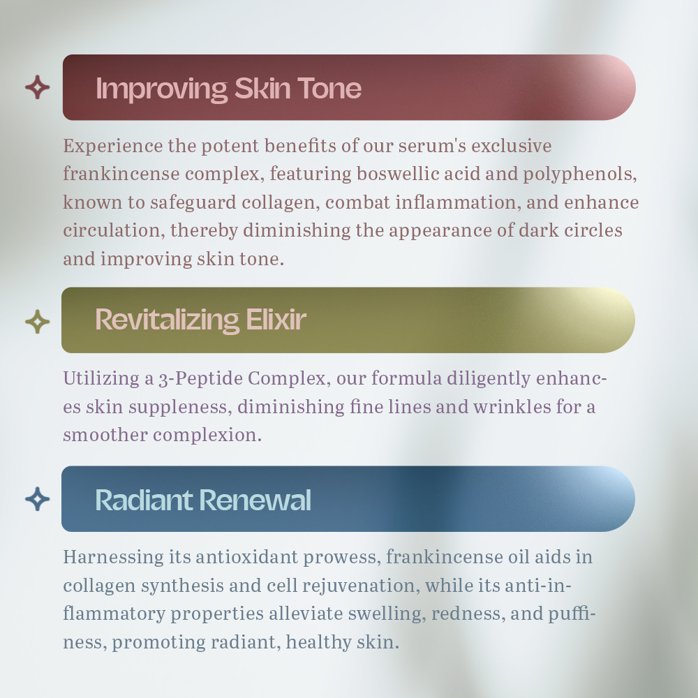 امنحي بشرتك مظهرًا شبابيًا وراحة متكاملة مع هذا السيروم المصمم خصيصًا للعناية بمنطقة محيط العين. يحتوي على خلاصة اللبان الطبيعي المعروفة بخصائصها الفعّالة في تجديد البشرة، إلى جانب مزيج من المكونات النشطة التي تستهدف التجاعيد بشكل مباشر وتعمل على تحسين مظهر البشرة.